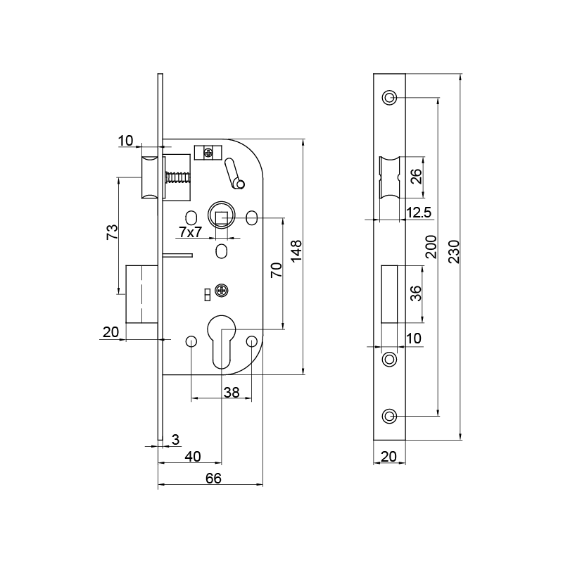 ■ latch in convex shape for a soft closing of door, driven by both lever handle and cylinder