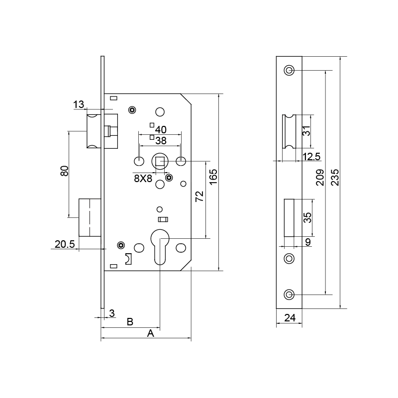 ■ latch in convex shape for a soft closing of door, driven by both lever handle and cylinder