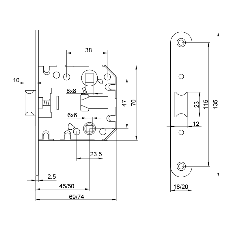 ■ latch driven by lever handle only, locked or unlocked by turn knob