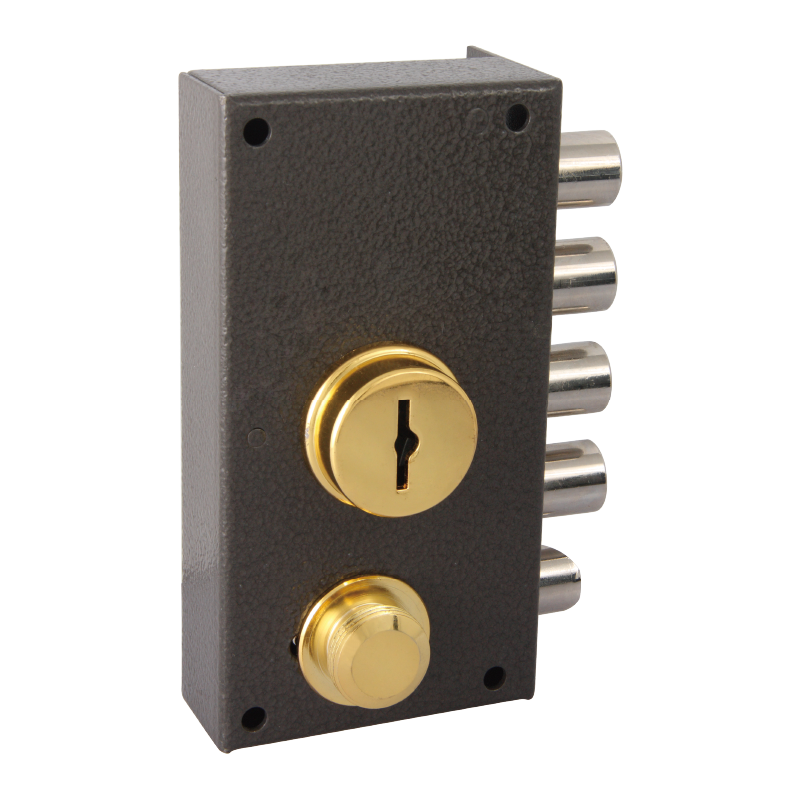 ■ Interior and exterior cylinders driven by key to operate both latch and bolts, button inside to move horizontally to operate the latch