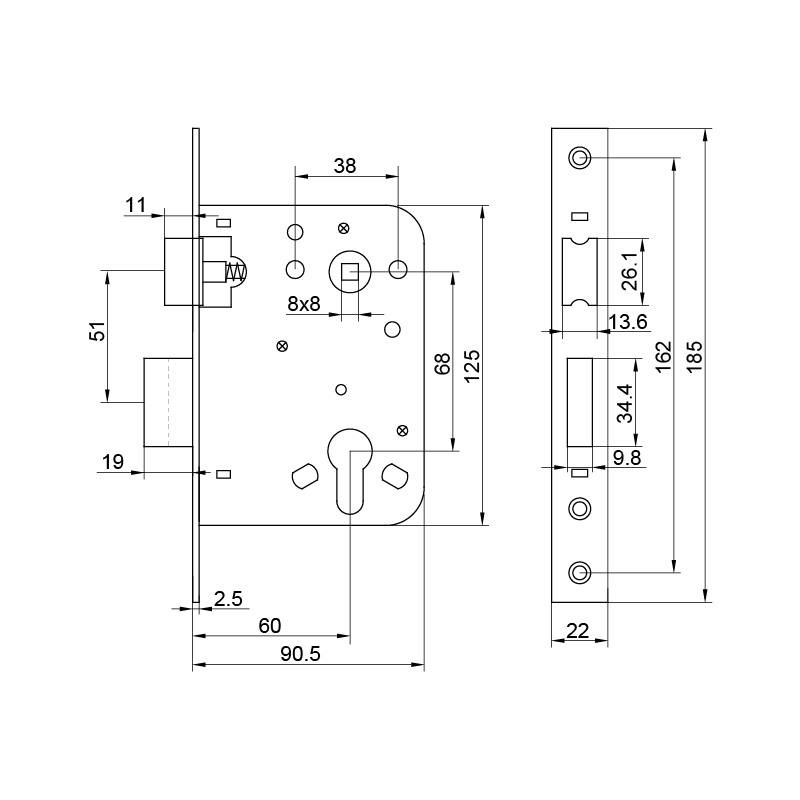 ■ latch in convex shape for a soft closing of door, driven by both lever handle and cylinder